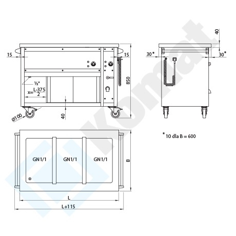 | 1165 | 700 | 850 | 3xGN1/1 | 30°C÷95°C | 230/50 | 3400 |