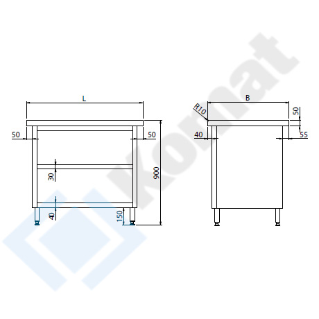 Stanowisko z szafką otwartą i półką. Blat centralny bez rantu o grubości 50mm, przygotowany do skręcenia na włos ze stanowiskami blatów sąsiednich. Wykonanie stal nierdzewna AISI 304. Promień R10 na górnej krawędzi blatu.