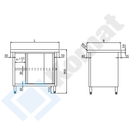 Stanowisko z szafką z drzwiami suwanymi. Blat centralny bez rantu o grubości 50mm, przygotowany do skręcenia na włos ze stanowiskami blatów sąsiednich. Wykonanie stal nierdzewna AISI 304. Promień R10 na górnej krawędzi blatu.