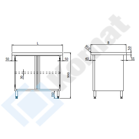 Stanowisko z szafką z drzwiami skrzydłowymi. Blat centralny bez rantu o grubości 50mm, przygotowany do skręcenia na włos ze stanowiskami blatów sąsiednich. Wykonanie stal nierdzewna AISI 304. Promień R10 na górnej krawędzi blatu.