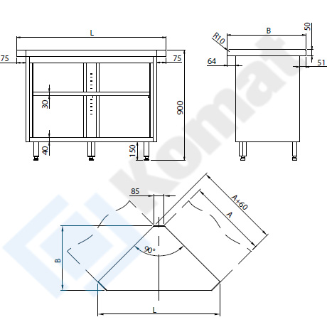 Stanowisko narożne wewnętrzne 90 st. z szafką i półką. Blat centralny bez rantu o grubości 50mm, przygotowany do skręcenia na włos ze stanowiskami blatów sąsiednich. Wykonanie stal nierdzewna AISI 304.