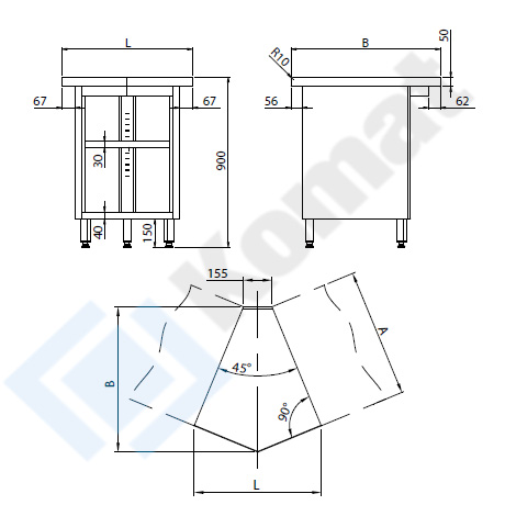 Stanowisko narożne wewnętrzne 45 st. z szafką i półką. Blat centralny bez rantu o grubości 50mm, przygotowany do skręcenia na włos ze stanowiskami blatów sąsiednich. Wykonanie stal nierdzewna AISI 304.