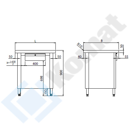 Stanowisko szafkowe bez półki. Blat centralny o grubości 50mm, przygotowany do skręcenia na włos z blatami sąsiednimi. Pojedyncza szulfada z zamkiem pod blatem. Wykonanie stal nierdzewna AISI 304. Promień R10 na górnej krawędzi blatu.