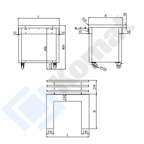 Mobilne stanowisko z miejscem na dystrybutor talerzy/tac. Blat centralny o grubości 50mm. Zabudowa dekoracyjna z 3-stron w formie paneli MDF #18mm. Narożniki stanowiska nierdzewne. 2-koła z hamulcem. Uchylna prowadnica tac.