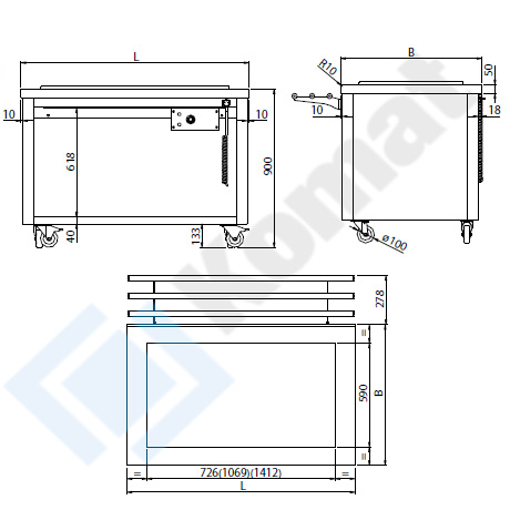 Mobilne stanowisko z płytą grzewczą nierdzewną. Szafka otwarta. Blat o grubości 50mm. Zabudowa dekoracyjna z 3-stron w formie paneli MDF #18mm. Narożniki nierdzewne. 2-koła z hamulcem. Uchylna prowadnica tac na froncie.