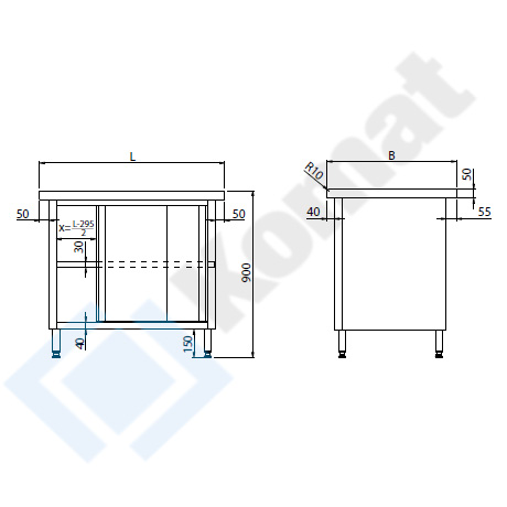 Stanowisko z szafką z drzwiami suwanymi. Blat centralny bez rantu o grubości 50mm, przygotowany do skręcenia na włos ze stanowiskami blatów sąsiednich. Wykonanie stal nierdzewna AISI 304. Promień R10 na górnej krawędzi blatu.