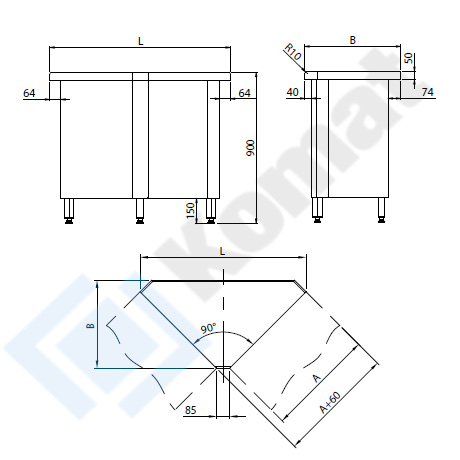 Stanowisko narożne zewnętrzne 90 st. z szafką i półką. Blat centralny bez rantu o grubości 50mm, przygotowany do skręcenia na włos ze stanowiskami blatów sąsiednich. Wykonanie stal nierdzewna AISI 304.