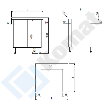 Stanowisko szafkowe z wycięciem w blacie na dystrybutor talerzy/tac. Blat centralny bez rantu o grubości 50mm, przygotowany do skręcenia na włos ze stanowiskami blatów sąsiednich. Wykonanie stal nierdzewna AISI 304.
