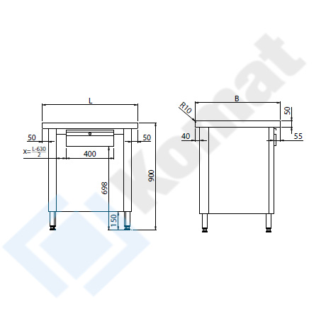 Stanowisko szafkowe bez półki. Blat centralny o grubości 50mm, skręcany na włos z blatami sąsiednimi. Pojedyncza szulfada z zamkiem pod blatem. Wykonanie stal nierdzewna AISI 304. Promień R10 na górnej krawędzi blatu.