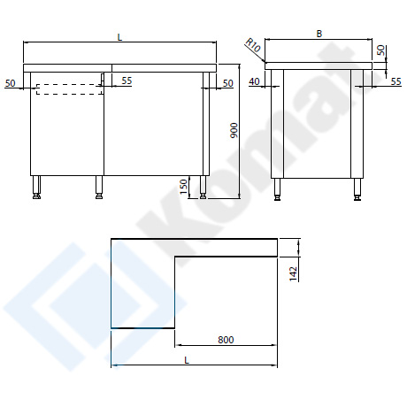 Boczne stanowisko kasowe szafkowe z zamykaną szufladą. Blat centralny o grubości 50mm, przygotowany do skręcenia na włos z blatami sąsiednimi. Wykonanie stal nierdzewna AISI 304. Promień R10 na górnej krawędzi blatu.