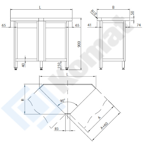Stanowisko narożne zewnętrzne 90 st. otwarte z półką dolną h=150 mm. Blat centralny bez rantu o grubości 50mm, przygotowany do skręcenia na włos ze stanowiskami blatów sąsiednich. Wykonanie stal nierdzewna AISI 304.