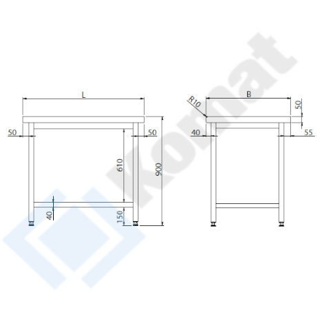 Stanowisko otwarte z półką dolną h=150 mm. Blat centralny bez rantu o grubości 50mm, przygotowany do skręcenia na włos ze stanowiskami blatów sąsiednich. Wykonanie stal nierdzewna AISI 304. Promień R10 na górnej krawędzi blatu.