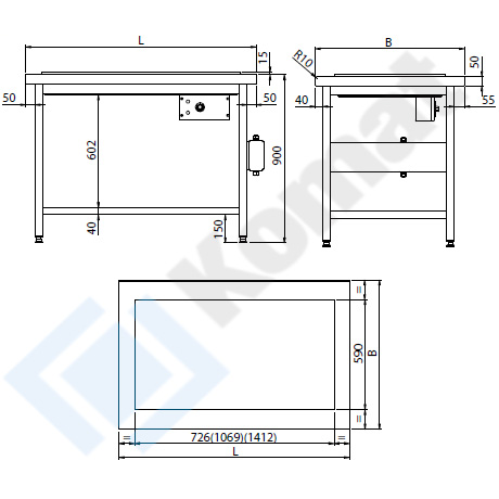 Stanowisko otwarte z płytą grzewczą nierdzewną, z półką dolną h=150 mm. Blat centralny o grubości 50mm, przygotowany do skręcenia na włos z blatami sąsiednimi. Promień R10 na górnej krawędzi blatu. Wykonanie AISI 304.