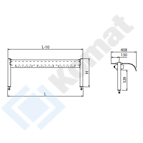 Krótka hartowana szyba gięta nadstawki. Dwa nierdzewne słupki boczne o średnicy Ø45mm wraz z rozetami przy blacie. Most instalacyjny pomiędzy słupkami z oświetleniem halogenowym. Zasilanie ukryte wewnątrz jednej z nóg.