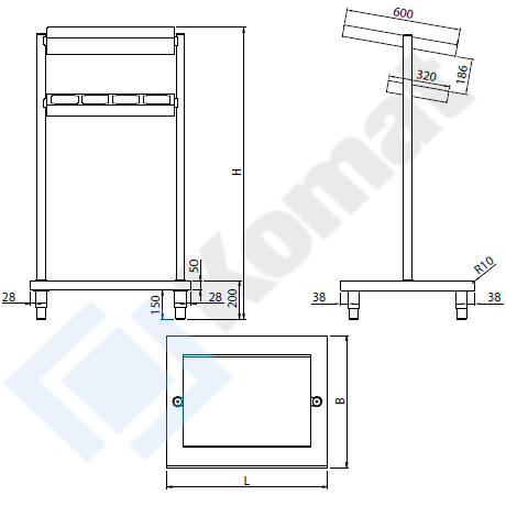 Pomocnik kelnerski 2-poziomowy wykonany ze stali nierdzewnej AISI 304. Górny poziom płaski z rantem z przodu, dolny poziom jako ramka na 4-pojemniki GN1/4 na sztućce. Wysokie słupki boczne wraz z dolną platformą na tace.