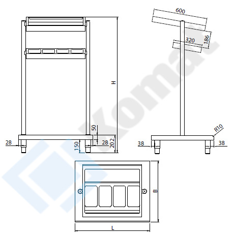 Pomocnik kelnerski 2-poziomowy wykonany ze stali nierdzewnej AISI 304. Górny poziom jako ramka na 2xGN1/1, dolny poziom jako ramka na 4-pojemniki GN1/4 na sztućce. Wysokie słupki boczne wraz z dolną platformą na tace.
