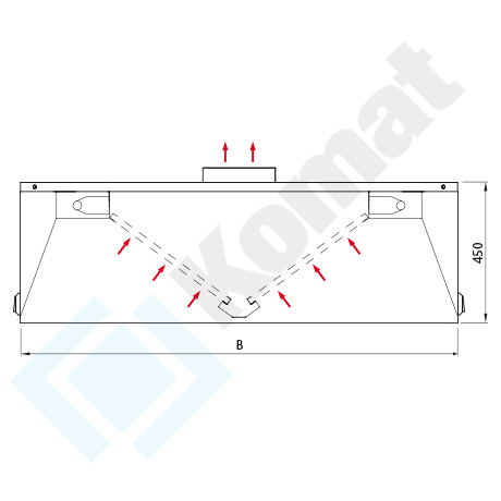 Centralny okap wyciągowy z kompletem filtrów labiryntowych oraz zintegrowanym oświetleniem LED. Ilość i średnicę króćcy określa zamawiający. Na dachu okapu po obu stronach uchwyty do zawiesi sufitowych.
