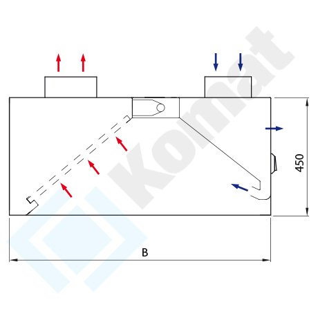 Przyścienny okap nawiewno-wyciągowy z kompletem filtrów labiryntowych oraz zintegrowanym oświetleniem LED. Ilość i średnicę króćcy określa zamawiający. Na plecach listwa do montażu ściennego. Na froncie uchwyty do zawiesi sufitowych.