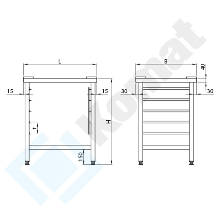 Podstawa pod piec z kompletem ślizgów na pojemniki GN 1/1 lub GN 2/1. Rozstaw między ślizgami t=70/100 mm. Górna rama z rantami ograniczającymi. Ilość ślizgów wynikowa. Nogi z regulacją wysokości.
