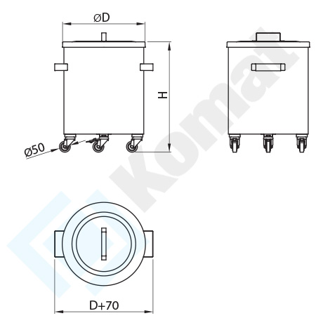 Okrągły pojemnik ze stali nierdzewnej z pokrywą. Średnica według tabeli. Koła o średnicy fi=50mm, w tym jedno z hamulcem - bieżnik gumowy. Nierdzewne uchwyty po obu stronach pojemnika.