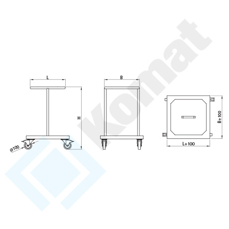 Stojak jezdny z półką dolną o grubości 40 mm. Górna konstrukcja na worek h=800 mm, z pełną pokrywą z uchwytem. Koła o średnicy fi=100 mm, w tym dwa z hamulcem - bieżnik gumowy.