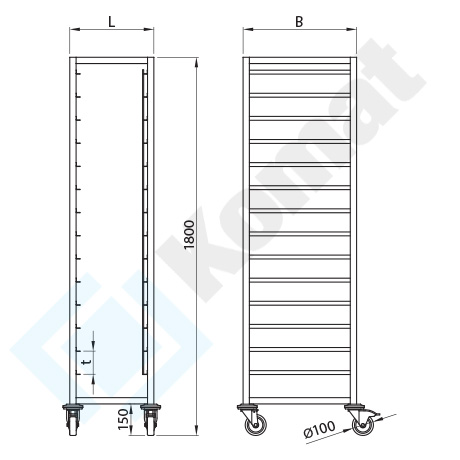 Regał jezdny z 14-poziomami ślizgów na pojemniki GN 1/1. Konstrukcja na bazie profili 30x30x1.2 mm. Koła o średnicy fi=100 mm, w tym dwa z hamulcem - bieżnik gumowy.