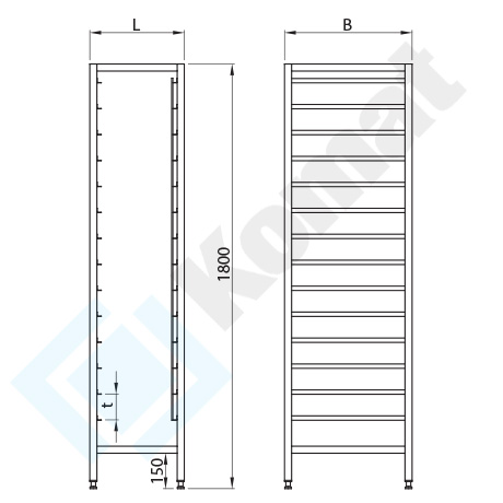 Regał stacjonarny z 14-poziomami ślizgów na pojemniki GN 2/1. Konstrukcja na bazie profili 30x30x1.2 mm. Regulacja wysokości regału w zakresie -10/+20 mm.