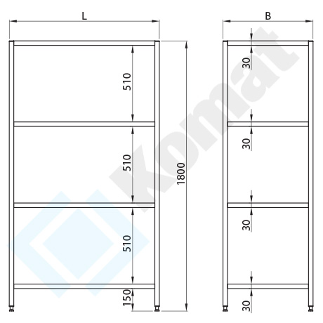 - 4x półka nieprzestawna wykonana z blachy #1.0mm, o grubości 30mm
