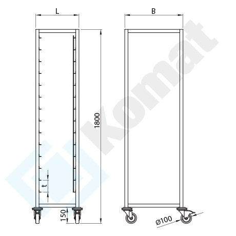 Regał jezdny z 10 lub 14-poziomami ślizgów na tace w rozmiarach zgodnie z tabelą. Konstrukcja na bazie profili 30x30x1.2 mm. Koła o średnicy fi=100 mm, w tym dwa z hamulcem - bieżnik gumowy. Nierdzewna zabudowa regału.