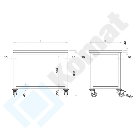 Stół na kołach, w tym dwa z hamulcem. Z półką dolną h=150 mm. Blat centralny bez rantów. Standardowa wysokość stołu H=850 mm.