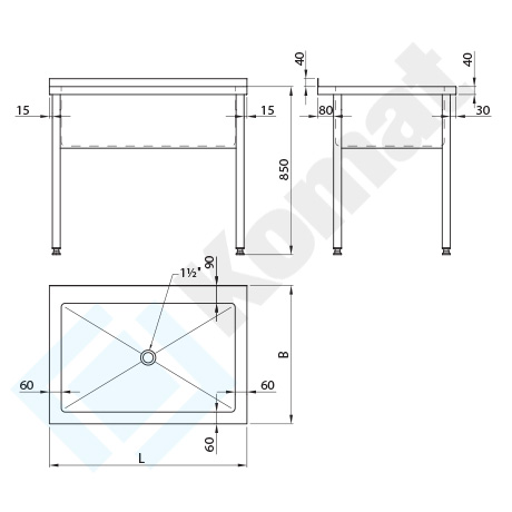 Stół z basenem 1-komorowym, bez półki dolnej. Blat z rantem z tyłu h=40 mm. Standardowa wysokość H=850 mm. Frontowa oraz boczne maskownice komory basenu. Standardowa głębokość komór basenu 300/400 mm.