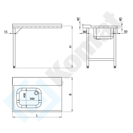 Stół załadowczy ze zlewem 1-komorowym zahaczany o zmywarkę kapturową, bez półki dolnej. Blat z zagłębieniem na kosz 500x500 mm. Rant tył h=40 mm. Wysokość stołu dostosowana indywidualnie do modelu zmywarki.