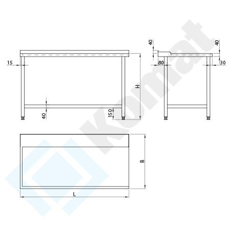 - półka dolna o grubości 40mm, wykonana z blachy o grubości 0,8 lub 1,0, w zależności od wymiaru L i B może być usztywniona profilem metalowym,
