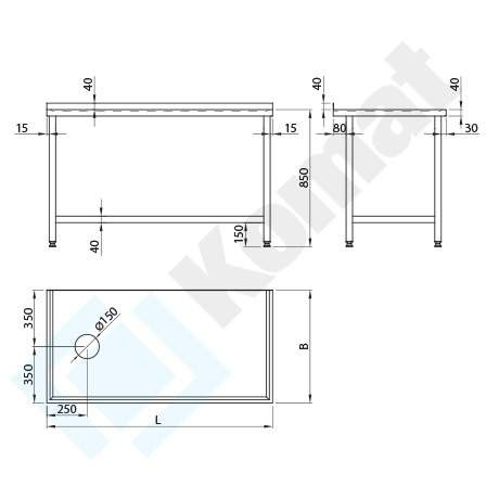 Stół sortowniczy bez półki dolnej, z łącznikami pomiędzy nogami h=150 mm. Blant rant tył h=40 mm, zagłębiony na całej powierzchni z otworem na odpadki fi=150 mm. Standardowa wysokość stołu H=850 mm.