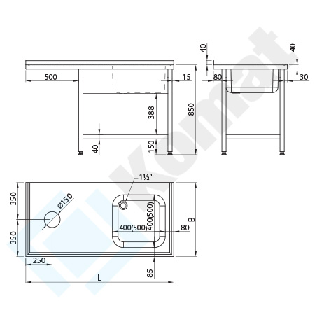 Stół ze zlewem 1-komorowym, półką dolną h=150 mm, z przestającym blatem L=500 mm i otworem na odpadki fi=150 mm. Blant rant tył h=40 mm, zagłębiony na całej powierzchni. Standardowa wysokość stołu H=850 mm.
