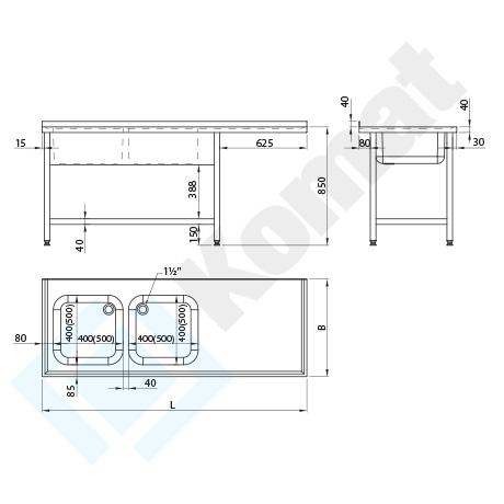Stół ze zlewem 2-komorowym i półką dolną h=150 mm, z przestającym blatem L=625 mm. Blant rant tył h=40 mm, zagłębiony na całej powierzchni. Standardowa wysokość stołu H=850 mm.