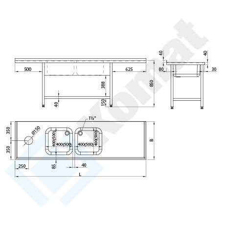 Stół ze zlewem 2-komorowym, półką dolną h=150 mm, z przestającym blatem z obu stron L=625/500 mm i otworem na odpadki fi=150 mm. Blant rant tył h=40 mm, zagłębiony na całej powierzchni. Standardowa wysokość stołu H=850 mm.