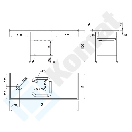 Stół ze zlewem 1-komorowym, półką dolną h=150 mm, z przestającym blatem z obu stron L=625/500 mm i otworem na odpadki fi=150 mm. Blant rant tył h=40 mm, zagłębiony na całej powierzchni. Standardowa wysokość stołu H=850 mm.