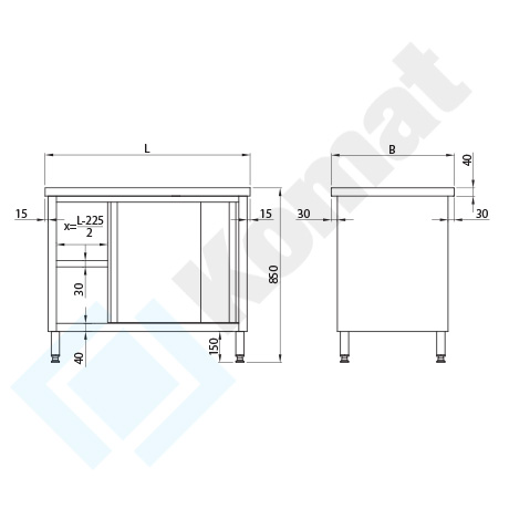 Stół przelotowy z drzwiami suwanymi z obu stron. Blat centralny bez rantów. Standardowa wysokość stołu H=850 mm.