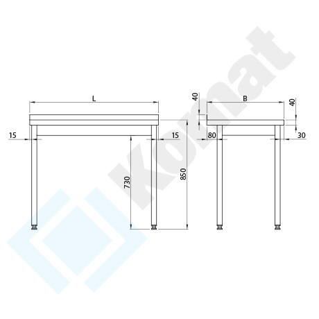 Podstawowy stół do pracy bez półki dolnej. Blat z rantem z tyłu h=40 mm. Standardowa wysokość stołu H=850 mm.