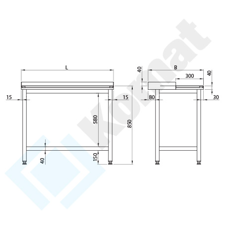 Stół do pracy z łącznikami dolnymi pomiędzy nogami h=150 mm. Blat ze zintegrowaną deską z polietylenu, z rantem z tyłu h=40 mm. Standardowa wysokość stołu H=850 mm.