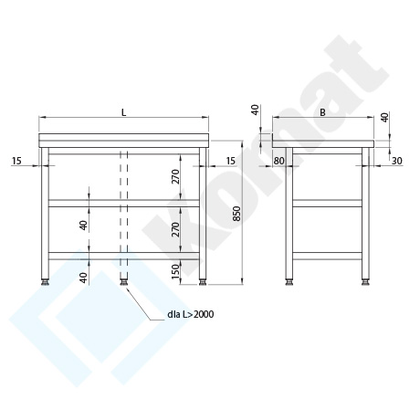 Podstawowy stół do pracy z półką dolną h=150 mm i dodatkową półką spawaną w połowie wysokości. Blat z rantem z tyłu h=40 mm. Standardowa wysokość stołu H=850 mm.