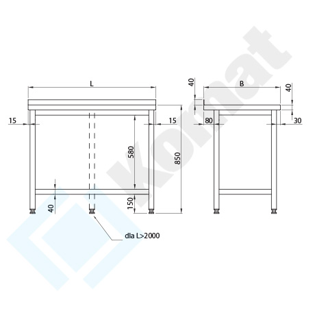 Podstawowy stół do pracy z półką dolną h=150 mm. Blat z rantem z tyłu h=40 mm. Standardowa wysokość stołu H=850 mm.