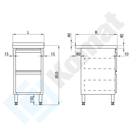 - nogi H=150mm wykonane z profili 40x40x1,2mm, zakończone stopą z Poliamidu PA6 z regulacją wysokości w zakresie -10/+20mm