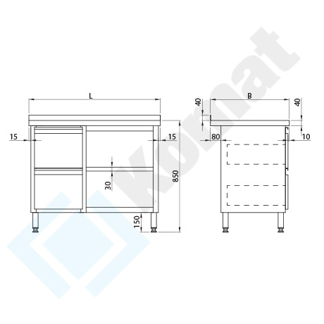- nogi H=150mm wykonane z profili 40x40x1,2mm, zakończone stopą z Poliamidu PA6 z regulacją wysokości w zakresie -10/+20mm