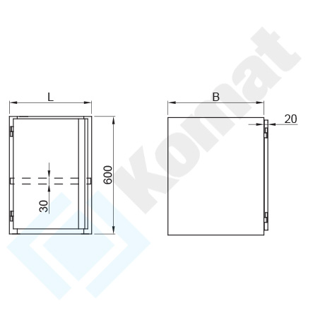 - 1x półka przestawna wykonana z blachy o grubości #1.0mm, wzmocniona profilem metalowym; regulacja wysokości co t=30mm