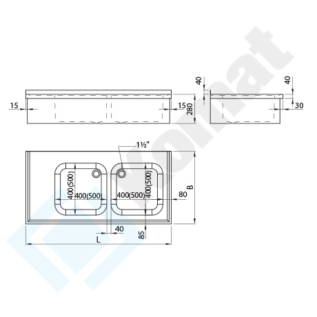 Blat nierdzewny z zabudową dolną, z dwoma komorami zlewu, o grubości 40 mm, wykonany z blachy #1.5 mm, wzmocniony profilami omega. Rant tył h=40 mm. Zagłębienie blatu na całej powierzchni. Montaż na konsolach.