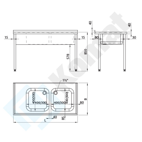 Stół ze zlewem 2-komorowym, bez półki dolnej. Blat z rantem z tyłu h=40 mm, z zagłębieniem na całej powierzchni. Maskownica frontowa pod blatem. Standardowa wysokość stołu H=850 mm.