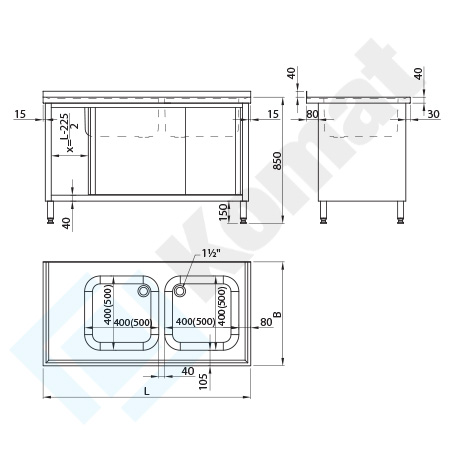 Stół ze zlewem 2-komorowym, z szafką z drzwiami suwanymi, bez pleców i półki przestawnej. Blat z rantem z tyłu h=40 mm, z zagłębieniem na całej powierzchni. Standardowa wysokość stołu H=850 mm.