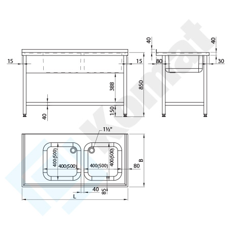 Stół ze zlewem 2-komorowym, z półką dolną h=150 mm. Blat z rantem z tyłu h=40 mm, z zagłębieniem na całej powierzchni. Maskownica frontowa pod blatem. Standardowa wysokość stołu H=850 mm.